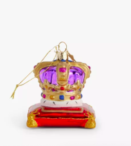 Selfridges edit glass Christmas decoration. 100% glass, British crown shape, glossy glitter finish, hanging thread loop