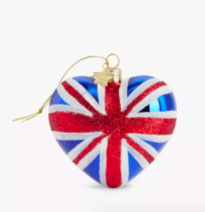 Selfridges edit glass Christmas decoration. 100% glass, Tree ornament, heart shape, hand-painted, British flag, Glittered finish. 8cm