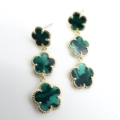 Inspired by he Aprel Van Cleef Magic Alahambra. As seen on British Royals Artistically crafted with intricate exquisite style! These gorgeous lightweight dangle post earrings feature triple cascading graduated 18kt gold plated green malachite clovers. Lightweight, ornate and delicately crafted, these stunning lightweight clovers earrings are truly one-of-a-kind and look great worn for any occasion.